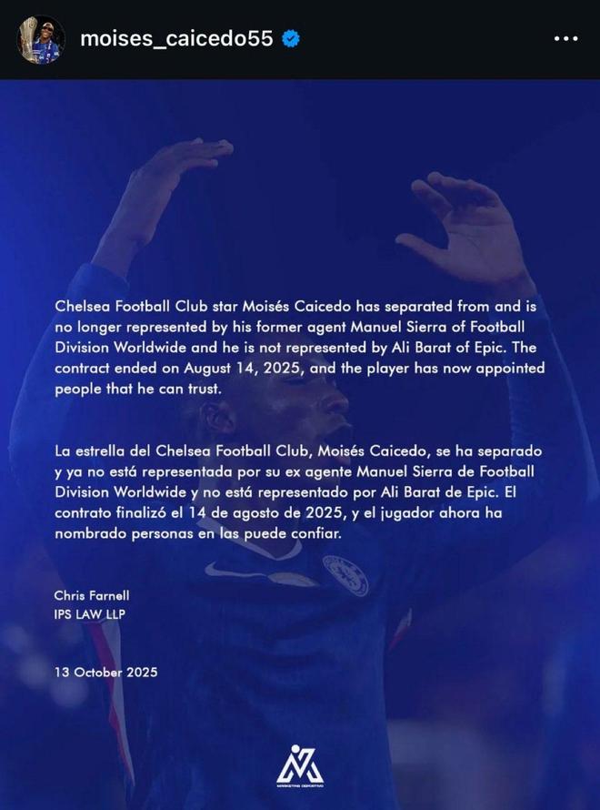 雷速體育10月14日訊 今日凌晨切爾西中場凱塞多在社媒自宣與前經(jīng)紀人合約到期,正式分道揚鑣,但隨后光速刪除了這條官宣貼。